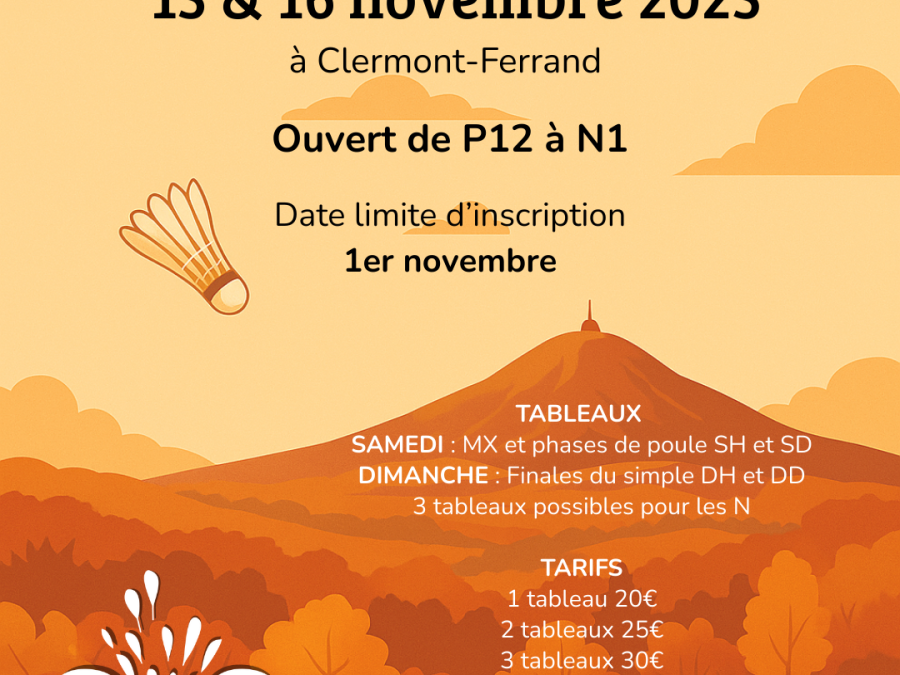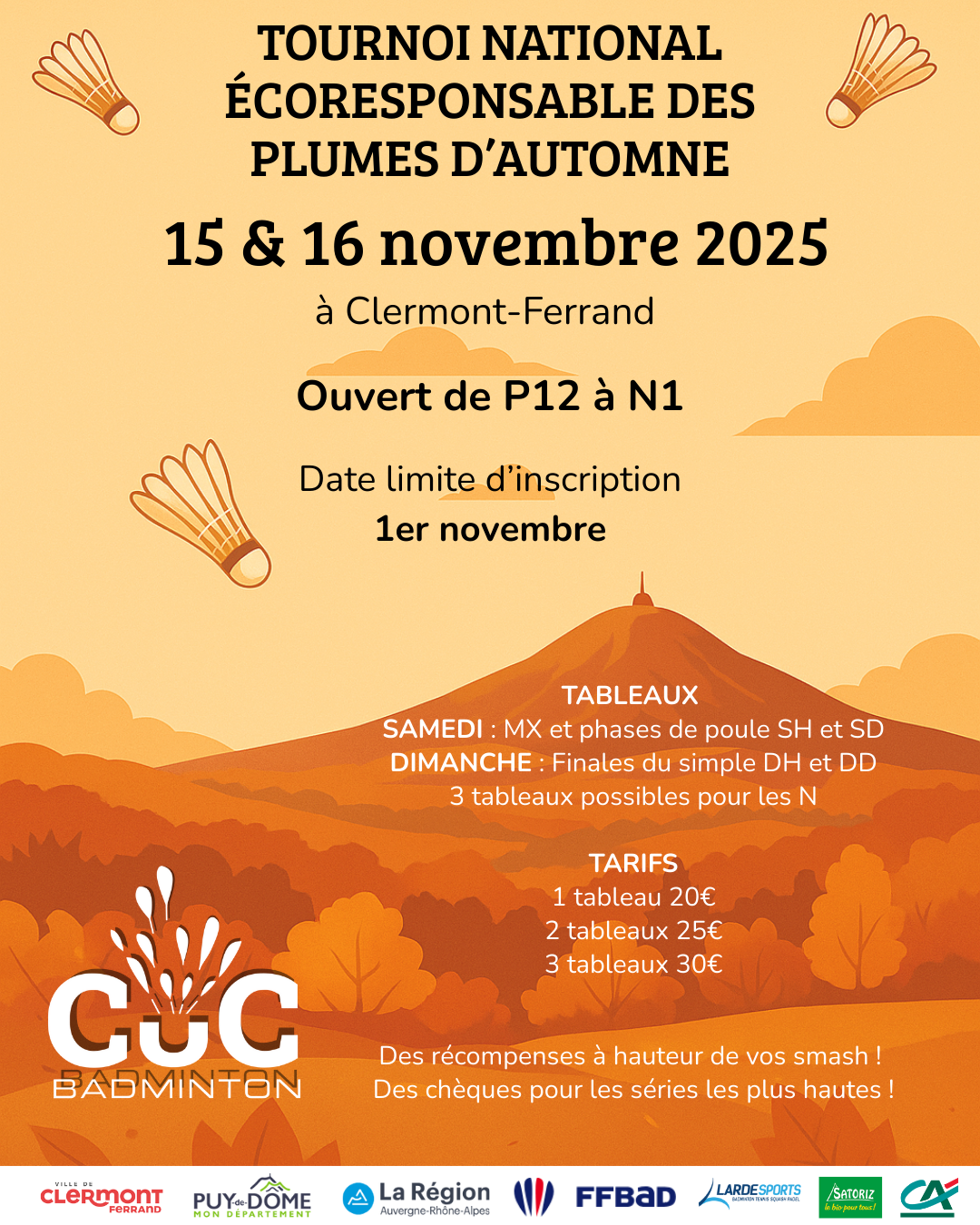 Le Clermont Université Club Badminton a eu le plaisir de vous inviter à son tournoi national La Dernière Suée Eco-Responsable, les 29 et 30 juin 2024, ouvert de N1 à P12.
