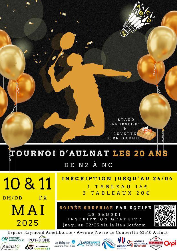 Pour toute demande, n'hésitez pas à nous contacter par mail (abcdtournoi@hotmail.fr), via Facebook (Aulnat Badminton) ou par téléphone (Jean-Paul ROUSSEL - 06 77 45 63 33)